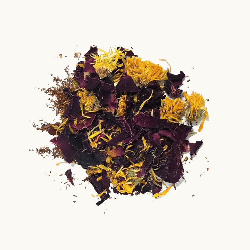Rose soothes, passionflower relaxes, and calendula supports skin and balance. Rich rooibos rounds it out for a smooth, comforting infusion of care.