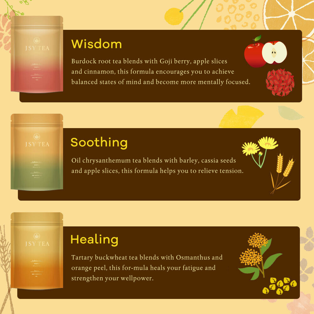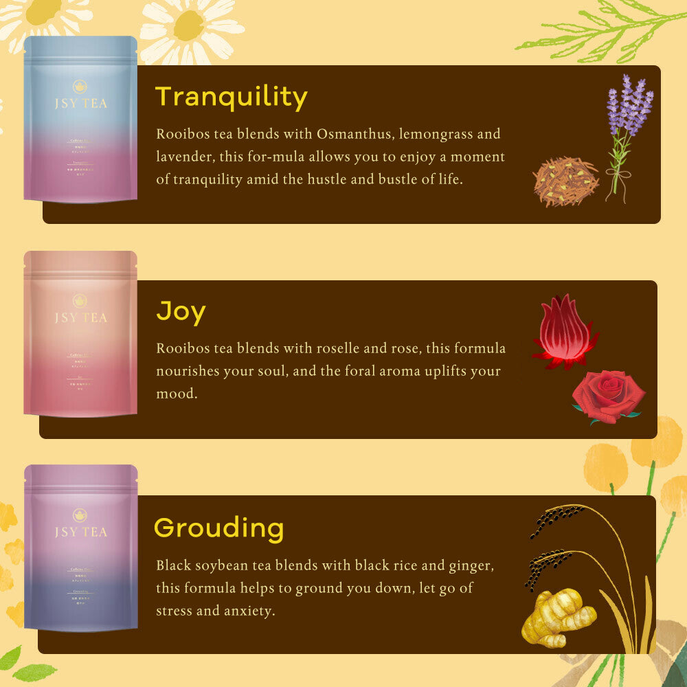 JSY Herbal Tea Bags:Grounding- Ginger & Black Rice+Wisdom-Goji Berries & Apples+Soothing-oil chrysanthemum & Barley+Joy-Roselle & Rose+Healing-Tartary Buckwheat &Osmanthus+Tranquility-Rooibos Tea & Lavender