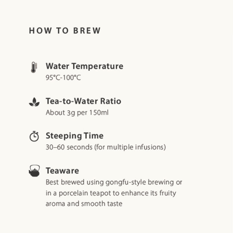 Best brewed using gongfu-style brewing orin a porcelain teapot to enhance its fruityaroma and smooth taste.